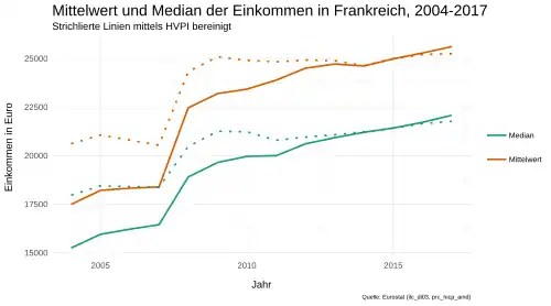 Im Jahr 2017 galten in Frankreich 13,3 % der Bevölkerung als armutsgefährdet.[18] Damit liegt Frankreich deutlich unter dem EU-Durchschnitt von 16,9. Auffallend ist, dass die Quote von 2008 bis 2012 um 1,6 Prozentpunkte angestiegen ist. Im Jahr 2012 erreichte die Armutsgefährdungsquote 14,1 % und damit den Höchstwert seit 2001. Dieser deutliche Anstieg dürfte mit der Weltfinanzkrise in Zusammenhang stehen, die zu rückläufigem Wirtschaftswachstum in Frankreich beitrug.