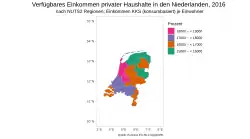 Auch wenn die regionalen Einkommen verhältnismäßig gleich verteilt sind, ist nichtsdestotrotz ein leichtes Nord-Süd-Gefälle zu erkennen. Während in den südlichen Regionen und in den mittleren Regionen in Küstennähe der Niederlande das pro Kopf verfügbare Einkommen 2016 bei 17.000 bis 18.000 Euro angesiedelt ist, verzeichnet die Bevölkerung des Nordens und in den mittleren Regionen innerhalb des Landes nur ein durchschnittliches Einkommen von 15.000 bis 17.000 Euro. Am oberen Ende der Einkommensverteilung sind vor allem die Regionen Noord-Holland mit der Hauptstadt Amsterdam sowie Utrecht mit ihrer gleichnamigen Stadt hervorzuheben. Im einkommensschwächeren Norden befinden sich bis auf die Stadt Groningen keine größeren Ballungsgebiete.