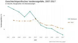 Die Grafik zum geschlechtsspezifischen Verdienstgefälle zeigt die Entwicklung des unbereinigten Gender-Wage-Gaps in den NACE Wirtschaftszweigen Industrie, Baugewerbe und Dienstleistungen (ohne Öffentliche Verwaltung, Verteidigung und Sozialversicherung) in den Niederlanden im Vergleich zu den EU-27-Mitgliedsländern. Der unbereinigte Gender-Wage-Gap repräsentiert den Unterschied zwischen dem durchschnittlichen Bruttostundenlohn von Frauen als Anteil am durchschnittlichen Bruttostundenlohn der Männer. Liegt das geschlechtsspezifische Verdienstgefälle zu Beginn des Beobachtungszeitraums 2007 noch bei über 19 %, verringert sich dieses bis 2017 kontinuierlich (mit Ausnahme des Jahres 2011) auf ca. 15 %. In den Niederlanden konnte der unbereinigte Gender-Wage-Gap somit innerhalb von 10 Jahren um 4 Prozentpunkte reduziert werden. Etwas anders stellt sich die Situation für den Gender-Wage-Gap in denselben Sektoren im europäischen Durchschnitt dar. 2008 bemisst sich das geschlechtsspezifische Verdienstgefälle im europäischen Durchschnitt mit 17,3 % und damit geringer als in den Niederlanden. Im Unterschied zu den Niederlanden gelingt den europäischen Ländern im Durchschnitt allerdings keine oder nur geringfügige Reduktion des Verdienstgefälles im Zeitverlauf. Bereits im Jahr 2012 gleicht sich das Gefälle zwischen den Niederlanden und den EU-27 aus und Frauen verdienen um 17,5 % weniger als Männer. Auch nach 2012 sinkt der Gender-Wage-Gap in den Niederlanden stärker als im europäischen Durchschnitt. Infolgedessen beläuft sich das geschlechtsspezifische Verdienstgefälle in den Sektoren Industrie, Baugewerbe und Dienstleistungen am Ende des Beobachtungszeitraumes 2017 auf 16 % und liegt damit um einen Prozentpunkt über dem Wert in den Niederlanden.