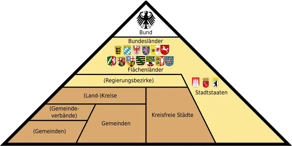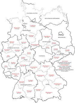Die Behörden der staatlichen Mittelinstanz werden regional unterschiedlich bezeichnet, so in Baden-Württemberg und Sachsen als Regierungspräsidien, in Nordrhein-Westfalen und Niedersachsen (bis zu ihrer Abschaffung im Jahr 2005) als Bezirksregierungen, in Hessen als Regierungsbezirke,[3] in Bayern als Regierungen, in Thüringen und seit 2004 in Sachsen-Anhalt als Landesverwaltungsämter und in Rheinland-Pfalz als Direktionen.