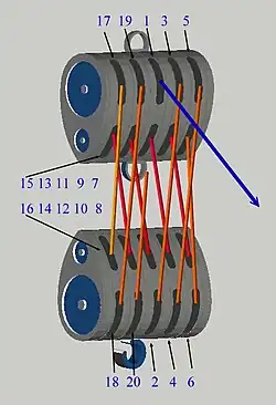 Der Vorteil dieser Einscherung liegt darin, dass die Rollen gleichmäßiger abgenutzt werden und das Seilpaket eine geringere Tendenz hat, sich in sich selbst zu verdrillen.