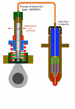- Bei pumpengesteuerten Systemen (Reihen- und Verteilereinspritzpumpen, Pumpe-Düse-Systeme) erzeugt die Pumpe den Druck, der die Düsennadel gegen die Kraft einer Feder anhebt. Sobald der Pumpendruck unter einen Grenzwert abfällt, schließt die Feder die Düse wieder.