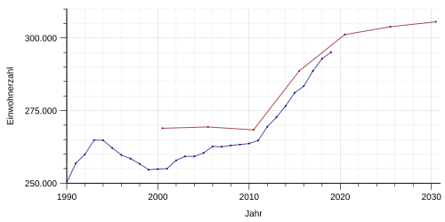 Ergebnisse der Bevölkerungsprognose der Stadt Augsburg (Wohnberechtigte Bevölkerung am Haupt- und Nebenwohnsitz):[5]