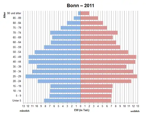 - ↑ Datenbank Zensus 2011, Bonn, Alter + Geschlecht