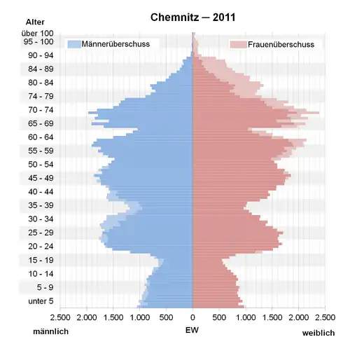 Neben dem Rückgang der Einwohnerzahl findet eine Verschiebung der Altersstruktur statt.[14] Ende 2002 lag der Anteil der unter 15-Jährigen, aufgrund einer niedrigen Geburtenrate, bei 10,1 %. Das war der niedrigste Stand einer Großstadt in Deutschland. Der Anteil der 15- bis 25-Jährigen lag bei 12,3 %, der der 25- bis 60-Jährigen bei 47,5 %. Der Anteil der über 60-Jährigen lag bei 30,1 % und stieg bis 30. September 2008 um 2,5 % auf 32,6 % und bis 31. März 2019 auf 34,56 %[15], was noch immer der höchste Wert einer deutschen Großstadt ist. Zwischenzeitlich zeigt sich eine Trendwende bei den Geburten. Am 7. November 2008 wurde mit der 1000. Geburt im Jahr 2008 im DRK-Krankenhaus Rabenstein das erste Mal seit der Wende die Marke von 1000 Geburten im Jahr überschritten. Der absolute Tiefpunkt war nach der Wende im Jahr 1993 mit 535 Geburten erreicht. Der Anteil der unter 15-Jährigen lag per 30. September 2008 bei 10,4 % und war damit im Vergleich zu 2005 um 0,3 % gestiegen; zum 31. März 2019 waren 13,4 % der Einwohner bis 15 Jahre alt. Seit dem Jahr 2019 ist jedoch wieder ein Rückgang zu verzeichnen.