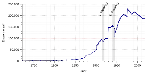 Im Ersten Weltkrieg sank die Bevölkerung um 10,9 Prozent. Bei der Volkszählung vom 5. Dezember 1917 wurden 83.509 Personen ermittelt. Davon waren 1.733 Militärpersonen und 952 Kriegsgefangene. Im Jahre 1928 überschritt die Einwohnerzahl der Stadt die Grenze von 100.000 Einwohnern, wodurch sie zur Großstadt wurde. Eingemeindungen mehrerer Orte am 1. August 1929 brachten einen Zuwachs von 46.755 Personen auf 147.000 Einwohner.