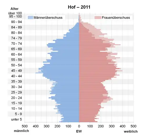 Nach der Volkszählung in der Europäischen Union 2011 betrug am 9. Mai 2011 die Einwohnerzahl der Stadt Hof 44.759 Bürger. Die behördliche Prognose vom Dezember 2016 für die Zeit bis 2036 geht von einem Rückgang der Einwohner um 10,4 % auf etwa 40.500 Personen aus.[7] Die Bevölkerungsvorausberechnung aus dem Jahr 2024 prognostiziert bis 2042 einen geringeren Rückgang der Einwohner um 1,9 % auf etwa 45.800 Personen.[8]