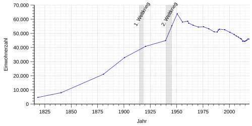 Die Einwohnerzahl der Stadt Hof blieb über die Jahrhunderte relativ konstant. Im Mittelalter und in der Folgezeit war die Stadt vergleichsweise groß, es wurde eines der ersten Gymnasien im deutschsprachigen Raum eröffnet. Erst im Biedermeier konnte die Stadt wieder leicht wachsen, in der Industrialisierung dehnte sich die Stadt dann schnell aus, die Einwohnerzahl wuchs zwischen 1840 und 1945 um über 47.000 Einwohner. Viele Arbeiter zog es vom umliegenden Land in die Stadt, andere kamen von weither, um Arbeit zu finden. 1950 erreichte die Bevölkerung dann ihren Höchststand mit fast 64.000 Menschen. Damit war Hof die achtgrößte Stadt in Bayern, und nach Bamberg die zweitgrößte in Oberfranken. Die Folgejahre waren in ganz Oberfranken gekennzeichnet von Abwanderung, gerade in Bamberg und Hof. Der Fall der Mauer hielt dies kurz auf, weil DDR-Bürger in Hof blieben. Jedoch schrumpfte die Stadt danach weiter. 2011 kam eine Trendwende, erstmals zogen wieder mehr Menschen nach Hof, als wegzogen. Die Geburtenzahl stieg im Jahr 2017 um 23 % zum Vorjahr, womit Hof den größten Anstieg von Geburten in Oberfranken hatte.[2] Bis 2018 wuchs die Stadt wieder auf über 47.000 Einwohner an. 2019 wies Hof erstmals seit 25 Jahren wieder ein Neubaugebiet aus. Nach einem leichten Rückgang der Einwohnerzahl wuchs die Stadt im Jahr 2022 um über 1.500 Einwohner auf 46.656.[3] Laut dem Landesamt für Statistik wurde im April 2024 mit 47.201 Einwohnern ein Höchststand erreicht.[4]
