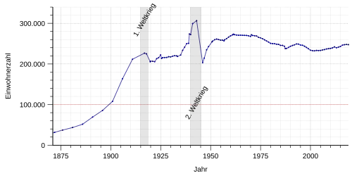Im Jahre 1900 überschritt die Einwohnerzahl der Stadt die Grenze von 100.000, wodurch sie zur Großstadt wurde. Bis 1910 verdoppelte sich diese Zahl auf 212.000. Der Zuwachs ist zum Teil auf Eingemeindungen zurückzuführen, überwiegend aber auf die Ansiedlung der Marine und den Aufschwung in der Werftindustrie. Nach dem Ersten Weltkrieg wurden weniger Arbeiter auf den Werften benötigt und die Anzahl der Marineangehörigen ging zurück. Durch weitere Eingemeindungen 1922 bis 1924 stieg die Bevölkerungszahl leicht.