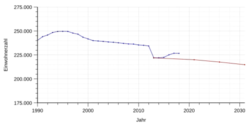 Gemäß Zensus 2011 liegt die Einwohnerzahl 2011 mit 221.864 Einwohnern bereits deutlich niedriger als die für 2025 prognostizierten 227.381 Einwohner.