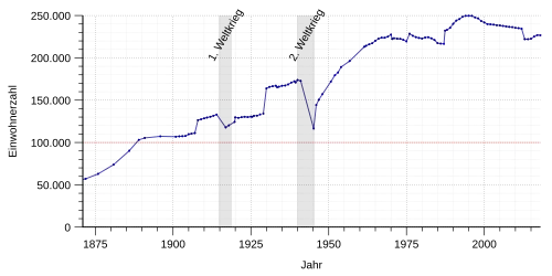 Die folgende Übersicht zeigt die Einwohnerzahlen nach dem jeweiligen Gebietsstand. Bis 1812 handelt es sich meistens um Schätzungen, danach um Volkszählungsergebnisse (¹) oder amtliche Fortschreibungen der Stadtverwaltung (bis 1970) und des Statistischen Landesamtes (ab 1971). Die Angaben beziehen sich ab 1834 auf die „Zollabrechnungsbevölkerung“, ab 1871 auf die „Ortsanwesende Bevölkerung“, ab 1925 auf die Wohnbevölkerung und seit 1987 auf die „Bevölkerung am Ort der Hauptwohnung“. Vor 1834 wurde die Einwohnerzahl nach uneinheitlichen Erhebungsverfahren ermittelt.