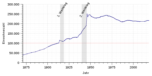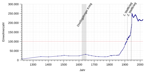Die folgende Übersicht zeigt die Einwohnerzahlen nach dem jeweiligen Gebietsstand. Bis 1788 handelt es sich meist um Schätzungen, danach um Volkszählungsergebnisse (¹) oder amtliche Fortschreibungen der Stadtverwaltung (bis 1970) und des Statistischen Landesamtes (ab 1971). Die Angaben beziehen sich ab 1871 auf die „Ortsanwesende Bevölkerung“, ab 1925 auf die Wohnbevölkerung und seit 1987 auf die „Bevölkerung am Ort der Hauptwohnung“. Vor 1871 wurde die Einwohnerzahl nach uneinheitlichen Erhebungsverfahren ermittelt.
