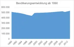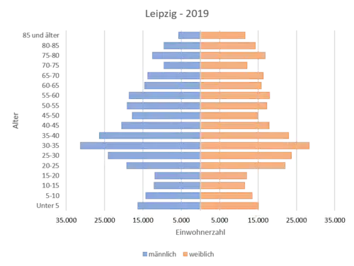 Im Jahr 2005 lebten in Leipzig wieder über 500.000 Menschen. Das ist ein Anstieg von 63.000 Einwohnern gegenüber 1998. Zum Teil ist dieser Zuwachs auf Eingemeindungen umliegender Kommunen in den Jahren 1999 und 2000 zurückzuführen. Die Ortsteile Burghausen und Rückmarsdorf gehörten zu den letzten Eingemeindungen der Stadt Leipzig.[3] Bereinigt um Eingemeindungen verlor Leipzig in den Jahren 1990 bis 2012 rund 4,6 % seiner Einwohner, gewann jedoch mit Eingemeindungen 4,0 % hinzu, bei einer Verdoppelung der Stadtfläche.[4] Seit einigen Jahren profitiert die Kernstadt jedoch auch von deutlichen Wanderungsgewinnen. Am 31. Dezember 2011 betrug die „Amtliche Einwohnerzahl“ für Leipzig nach Fortschreibung des Statistischen Landesamtes des Freistaates Sachsen 510.043[5] (nur Hauptwohnsitze und nach Abgleich mit den anderen Landesämtern). Während Leipzig auf der Liste der größten deutschen Städte 1946 mit knapp 608.000 Einwohnern noch den vierten Platz hinter München belegte, fiel die Stadt im Jahr 2010 auf Platz dreizehn zurück. Ende 2019 lag sie auf Platz 8.[6]