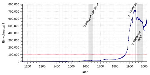 Die folgende Übersicht zeigt die Einwohnerzahlen nach dem jeweiligen Gebietsstand. Bis 1825 handelt es sich meist um Schätzungen, danach um Volkszählungsergebnisse (¹) oder amtliche Fortschreibungen der Stadtverwaltung (bis 1944), der Staatlichen Zentralverwaltung für Statistik (1945 bis 1989) und des Statistischen Landesamtes (ab 1990). Die Angaben beziehen sich ab 1834 auf die „Zollabrechnungsbevölkerung“, ab 1871 auf die „Ortsanwesende Bevölkerung“, ab 1925 auf die Wohnbevölkerung und seit 1966 auf die „Bevölkerung am Ort der Hauptwohnung“. Vor 1834 wurde die Einwohnerzahl nach uneinheitlichen Erhebungsverfahren ermittelt.