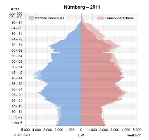 - ↑ Datenbank Zensus 2011, Nürnberg, Alter + Geschlecht