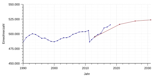 Nach dem Zensus 2011 ist die amtliche Bevölkerungszahl (Stand Ende 2011) laut Statistischem Landesamt von 510.602 auf 490.085 gesunken.[2]