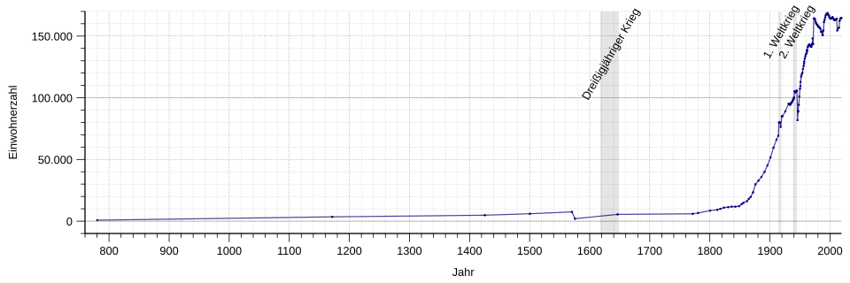 Die folgende Übersicht zeigt die Einwohnerzahlen nach dem jeweiligen Gebietsstand. Bis 1823 handelt es sich meistens um Schätzungen, danach um Volkszählungsergebnisse (¹) oder amtliche Fortschreibungen der Stadtverwaltung (bis 1970) und des Statistischen Landesamtes (ab 1971). Die Angaben beziehen sich ab 1855 auf die „Zollabrechnungsbevölkerung“, ab 1871 auf die „Ortsanwesende Bevölkerung“, ab 1925 auf die Wohnbevölkerung und seit 1987 auf die „Bevölkerung am Ort der Hauptwohnung“. Vor 1855 wurde die Einwohnerzahl nach uneinheitlichen Erhebungsverfahren ermittelt.