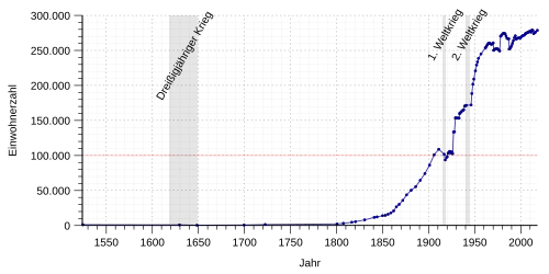 Die folgende Übersicht zeigt die Einwohnerzahlen nach dem jeweiligen Gebietsstand. Bis 1830 handelt es sich meist um Schätzungen, danach um Volkszählungsergebnisse (¹) oder amtliche Fortschreibungen der Stadtverwaltung (bis 1969) und des Statistischen Landesamtes (ab 1970). Die Angaben beziehen sich ab 1840 auf die „Zollabrechnungsbevölkerung“, ab 1871 auf die „Ortsanwesende Bevölkerung“, ab 1925 auf die Wohnbevölkerung und seit 1987 auf die „Bevölkerung am Ort der Hauptwohnung“. Vor 1840 wurde die Einwohnerzahl nach uneinheitlichen Erhebungsverfahren ermittelt.