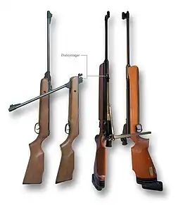 - Kipplaufsysteme (Die Feder wird mittels einer entsprechenden Mechanik am nach unten kippenden Lauf gespannt, Haenel 300)[1] oder Haenel 303