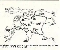 Am 7. November 1957[1] erreichte die Fernbahnelektrifizierung mit 3 kV den Prager Raum. Um den Lokomotivdurchlauf zu vereinfachen, wechselte man zuerst die Polarität im Prager Knoten. Damit konnten die auf den Betrieb mit 3 kV ausgelegten Triebfahrzeuge mit verringerter Leistung im Stadtgebiet weiterfahren. Am 15. Mai 1962[2] wurde dann die Fahrdrahtspannung an das übrige Fernbahnnetz angeglichen.