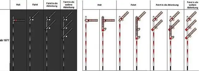 Formvorsignale zeigen nur an, ob das dazugehörige Hauptsignal Halt oder einen Freibegriff zeigt.