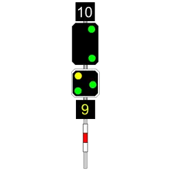 • Zwischensignale, die es nur in den Bahnhöfen gibt, unterteilen die Hauptgleise in Fahrwegsabschnitte und dienen zur Sicherung von Weichen- und Gleiskreuzungen, die nicht von Ein- und Ausfahrtsignalen abhängig sind.