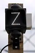 Ankündigungssignal Eine schwarze Kennziffer auf einer auf der Spitze stehenden dreieckigen rückstrahlenden gelben Tafel mit weißem Rand. Bei beschränkten Raumverhältnissen kann die Dreieckspitze nach oben zeigen.