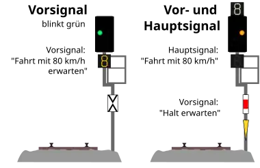 Das angekündigte Signal folgt in der Regel im Abstand des Bremsweges. Der Bremsweg kann je nach Strecke unterschiedlich sein, er beträgt auf Hauptbahnen generell 1000 Meter, auf Nebenbahnen auch 700 oder 400 Meter. Ein um mehr als 5 % verkürzter Bremsweg wird am Vorsignal besonders angezeigt. Praktisch können die Abstände zwischen Haupt- und Vorsignalen oder zwischen Hauptsignalen deutlich größer sein. Auf Strecken mit einer Streckengeschwindigkeit von 160 km/h wird bei Stellwerksneubauten ein Vorsignalabstand von 1300 m realisiert.