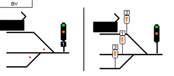 | Warnung Das nächste Signal zeigt „Halt“ an. | Halt Halt vor dem Signal. Dem Signal geht ein „Warnung“ zeigendes Signal voraus. Ausnahme: Das vorausgehende Signal kann „Kurze Fahrt“ zeigen oder ist eine Merktafel zur Ankündigung eines Einfahrtsignals ohne Vorsignal. |