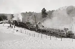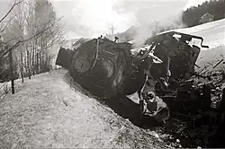 - Der Nachtzug Nr. 607 von Oslo V nach Bergen, gezogen an der Unfallstelle von der Dampflokomotive Nr. 403 der Baureihe 31b. Die Züge nach Bergen verkehrten während des Krieges vom Westbahnhof (Oslo V) aus, weil ab hier ein längerer Abschnitt mit Elektrolokomotiven zurückgelegt und so Kohle gespart werden konnte.[1]