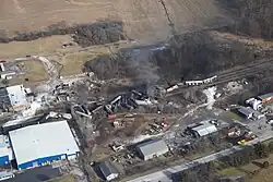 | 55 | Kesselwagen mit Vinylchlorid (gasförmig; UN 1086) | entgleist; Ladung ab 6. Februar bewusst freigesetzt und verbrannt |