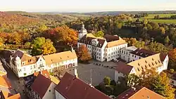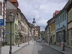 Nachweislich gehen die Wurzeln der Stadt bis in die Steinzeit zurück. Die älteste bekannte Ansiedlung befand sich im Norden des heutigen Stadtgebietes. Diese wurde vermutlich im 14. oder 15. Jahrhundert aufgegeben. Unterschiedlichen Angaben zufolge wanderten die Bewohner ins heutige Polen aus oder zogen aufgrund der Zerstörungen im Sächsischen Bruderkrieg in die im 12. Jahrhundert entstandene neue Stadt nahe der Burg.[3] Selbige war ein Vorgängerbau des jetzigen Schlosses. Sie wurde im 12. Jahrhundert im Auftrag des Markgrafen von Meißen errichtet. Im 16. Jahrhundert wurde sie umgebaut, 1677–1692 dann unter Herzog Christian von Sachsen-Eisenberg zum heute noch erhaltenen und nach ihm benannten Schloss Christiansburg ausgebaut.[4]