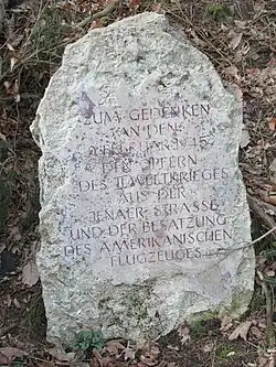 Am 9. Februar 1945 kollidierten im Raum zwischen Jena und Eisenberg zwei Bomber der United States Army Air Forces vom Typ Boeing B-17 „Flying Fortress“, nachdem einer von ihnen durch Flak beschädigt worden war. Dem anderen war beim Zusammenstoß das Heck abgerissen worden, er stürzte im Eisenberger Mühltal ab, 50 Meter nördlich der Pfarrmühle. Acht Besatzungsmitglieder kamen ums Leben, der Heckschütze konnte sich retten. Vor dem Absturz entledigte sich die Maschine noch ihrer Bomben über Eisenberg. Diese explodierten zwar nicht, zerstörten dennoch zwei Häuser, beschädigten weitere und töteten zehn Menschen.[13]