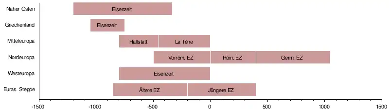 Stark vereinfachter zeitlicher Vergleich der Eisenzeit in ausgewählten Kulturregionen:[3]