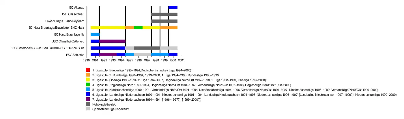Im Laufe der 1990er-Jahre meldeten sich auch weitere Harzer Teams vom Spielbetrieb ab und führten ihre Aktivitäten als Hobbyteams fort oder lösten die Mannschaften komplett auf. Nachdem die EHG Bad Lauterberg (1989) und die ESG Vienenburg/Wiedelah (1990) bereits zu Beginn des Jahrzehnts aus dem Ligaspielbetrieb des Niedersächsischen Eissport-Verbands ausgestiegen waren, folgten 1994 auch der USC Clausthal-Zellerfeld und der EHC Osterode. Ein kurzes Gastspiel hatte noch der EC Altenau, der in der Saison 1999/2000 für ein Jahr in der Niedersachsenliga spielte. Demgegenüber erfuhr der Hobbyspielbetrieb einen deutlichen Zuwachs, z. B. ab 1994 durch den EHC Osterode oder die neuen Teams Ice Bulls und Power Bully’s Eishockeyteam, die ihre Heimspiele in der Eissporthalle Altenau austrugen.[77][78][79][80][93][A 11][94][95]