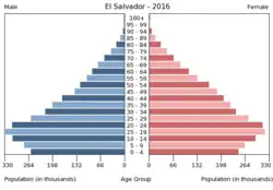 El Salvador hatte 2022 6,3 Millionen Einwohner.[8] Das jährliche Bevölkerungswachstum betrug + 0,4 %. Zum Bevölkerungswachstum trug ein Geburtenüberschuss (Geburtenziffer: 15,8 pro 1000 Einwohner[9] vs. Sterbeziffer: 8,2 pro 1000 Einwohner[10]) bei. Die Anzahl der Geburten pro Frau lag 2022 statistisch bei 1,8, die der Region Lateinamerika und die Karibik betrug 1,8.[11] Die Lebenserwartung der Einwohner El Salvadors ab der Geburt lag 2022 bei 71,5 Jahren[12] (Frauen: 75,8[13], Männer: 66,8[14]). Der Median des Alters der Bevölkerung lag im Jahr 2021 bei 26,3 Jahren.[15] Im Jahr 2023 waren 25,0 Prozent der Bevölkerung unter 15 Jahre,[16] während der Anteil der über 64-Jährigen 8,4 Prozent der Bevölkerung betrug.[17]