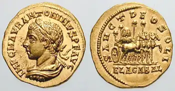 Den heiligen Stein von Emesa, der dort im Mittelpunkt des Elagabal-Kults stand, brachte der Kaiser nach Rom mit. Es war also von Anfang an geplant, den bisher nur in Emesa verehrten Elagabal zum Reichsgott zu machen. Auf dem Palatin wurde zur Unterbringung des Steins ein Tempel, das Elagabalium, gebaut[15] und eine Priesterschaft eingerichtet. Ein weiterer Elagabal-Tempel befand sich außerhalb der Hauptstadt.[16] Oberpriester war der Kaiser selbst (sacerdos amplissimus dei invicti Solis Elagabali). Mit einer prunkvollen Festprozession im Sommer waren Spiele und Volksbelustigungen verbunden.[17] Verschiedene Rückseitenmotive der unter Elagabal geprägten Münzen nehmen auf die von ihm gepflegten religiösen Vorstellungen Bezug: Ein Aureus (Goldmünze) zeigt auf der Quadriga den Stein von Emesa,[18] weitere Rückseiten mit dem opfernden Kaiser benennen Elagabal als unbesiegbaren Priester oder als Priester des Sonnengottes.