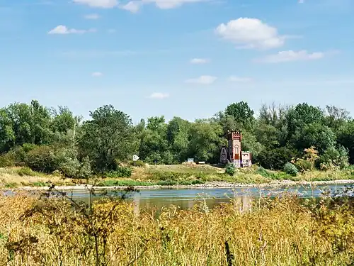 ![]() Elbe bei Magdeburg mit dem auch als Mäuseturm bezeichneten Schöpfwerk bei Prester. | ||
