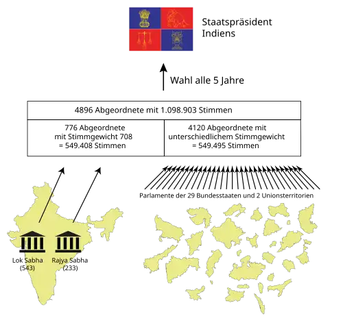 Insgesamt umfasst das Electoral College damit 4896 Abgeordnete. Durch ein ausgeklügeltes Verfahren der Stimmgewichtung wird gewährleistet, dass die 776 Parlamentarier des gesamtindischen Parlaments (Lok Sabha und Rajya Sabha) zusammengenommen dasselbe Stimmgewicht haben, wie die 4120 Parlamentarier aus den Bundesstaaten und Unionsterritorien.