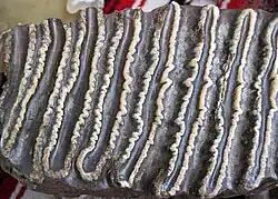Kennzeichnendes Merkmal der hinteren Zähne ist ihr Aufbau aus einzelnen Lamellen, was entsprechend als lamellodont bezeichnet wird.[25] Die einzelnen Lamellen bestehen aus Zahnschmelz und sind in einer Matrix aus Zahnzement eingebettet. Je nach Art unterscheiden sich die Zähne in Anzahl und Verlauf der Schmelzlamellen, sie haben somit taxonomischen Wert. Ein unterscheidendes Kriterium ist dabei die Lamellenfrequenz, die sich aus der Anzahl der Schmelzlamellen auf je zehn Zentimeter Zahnlänge ergibt. Bewertungsgrundlage ist zumeist der dritte Mahlzahn, der am größten wird und dem zufolge die höchste Anzahl an Schmelzfalten aufweist. Er kann bis zu 5 kg wiegen und besitzt beim Afrikanischen Elefanten bis zu 13, beim Asiatischen bis zu 24 Schmelzlamellen. Das ausgestorbene Wollhaarmammut (Mammuthus primigenius) hatte als am stärksten spezialisierte Elefantenart Backenzähne mit bis zu 30 Schmelzlamellen. Generell nimmt die Anzahl der Schmelzlamellen innerhalb der einzelnen Entwicklungslinien (Gattung) der Elefanten zu. Dies geht einher mit einer Ausdünnung des Zahnschmelzes, so dass stammesgeschichtlich jüngere Formen gegenüber älteren weitgehend schmalere und engerstehende Lamellen besitzen. Die Zunahme der Schmelzlamellen je Zahn reflektiert wiederum unmittelbar die wechselnden Ernährungsweisen der Tiere. Um mit dem ausdünnenden Zahnschmelz den starken Abrasionskräften beim Kauen zu widerstehen, formte dieser einerseits extrem enge Faltungen und Windungen aus, andererseits kam es auch zur Aufhöhung der Zahnkronen. Heutige Elefanten haben hochkronige (hypsodonte) Backenzähne (das heißt, die Zahnhöhe übertrifft die Zahnbreite), ursprünglichere Formen wiesen demgegenüber häufig niederkronige (brachyodonte) Zähne auf.[26][13][27][28]