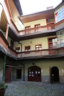 Der bauliche Kern der Vierflügelanlage mit romanischen Kellerräumen stammt aus dem 14. Jahrhundert jedoch wurde das heutige äußere Erscheinungsbild mit der turmartigen Erhöhung im Osten und dem zweigeschossigen Kastenerker, sowie die Schafensterläden mit Schnitzereien erst im 15. Jahrhundert geprägt. Im Jahr 1881 wurde die Einfahrt in den Binnenhof des Hauses für die Einrichtung eines weiteren Ladengeschäftes umgebaut. Dabei entdeckte man an freigelegten Hausmauern Fresken im Stil eines Frieses mit Schriftband und Schilden mit den Wappen namhafter Regensburger Familien. Dargestellt waren Szenen aus dem Ritterleben im frühen 14. Jahrhundert. Obwohl die Entdeckung der Fresken zunächst großes Aufsehen erregte, wurden die Fresken teilweise zerstört oder wieder überputzt. Ein Tor mit klassizistischen Flügeln führt zum Binnenhof, der im 18. Jahrhundert mit zweigeschossigen Galerien mit Umgängen umgeben wurde.[6]