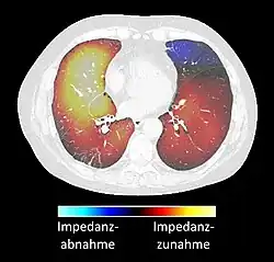 Dass sich der medizinische Durchbruch der EIT-Technologie zunächst im Bereich der Lungenfunktionsdiagnostik anbahnt bzw. vollzieht, liegt zum einen daran, dass menschliches Lungengewebe eine etwa fünffach geringere Leitfähigkeit als anderes Weichgewebe im Brustkorb aufweist (hoher Kontrast), zum anderen aber auch daran, dass die elektrische Leitfähigkeit der Lunge zwischen maximaler Aus- und Einatmung zyklisch um ein Vielfaches schwankt. Deshalb lassen sich bestimmte klinische Fragestellungen, vor allem wenn sie mit einer Inhomogenität der Lungenbelüftung einhergehen (z. B. Minderbelüftung bzw. Überblähung einzelner Lungenareale, Lungenkollaps etc.) mit der EIT besonders gut adressieren, da intrathorakale Impedanzveränderungen stark mit Veränderungen der regionalen Lungenventilation korrelieren.[3][20] Unterschiede der individuellen Hautleitfähigkeit oder Elektrodenpositionierung, welche bei der rein morphologischen a-EIT Schwierigkeiten bereiten, können bei dieser Form der relativen f-EIT mehr oder weniger vernachlässigt werden, da diese Faktoren zwischen Ein- und Ausatmung nur gering variieren und sich potentiell resultierende Artefakte somit selbst eliminieren. Durch die jüngsten Fortschritte der digitalen Weiterverarbeitung der gewonnenen Rohdaten ist es dem Intensivmediziner inzwischen möglich die regionale Lungenaktion direkt am Patientenbett und in Echtzeit zu visualisieren. Nach Jahren der Prototypen, die zumeist das Forschungsstadium nicht überschritten (Maltron: Sheffield Mark 3.5[21], Timpel SA: Enlight[22], CareFusion: Goe MF II) werden nun seit kurzem in größerem Rahmen die ersten Serienmodelle intensivmedizinischer Lungenfunktionsmonitore kommerziell vertrieben (Dräger Medical GmbH: Pulmovista 500 bzw. Swisstom AG: Swisstom BB2).[23] In Schwerpunktzentren und größeren Kliniken werden diese Monitore bereits vereinzelt innerhalb der klinischen Routine eingesetzt, beispielsweise im Rahmen der intensivmedizinischen Behandlung von Patienten mit einem akuten progressiven Lungenversagen (Acute Respiratory Distress Syndrome, ARDS). Die zunehmende Verbreitung dieser kommerziellen EIT-Systeme wird zeigen, ob sich die vielversprechenden Ergebnisse tierexperimenteller Studien (Identifikation des optimalen PEEP-Niveaus, Vermeidung der Ventilator-assoziierten Lungenschädigung (VILI), Detektion eines Pneumothorax etc.) auch auf den Menschen übertragen lassen. Die erste prospektive Outcome-Studie zur EIT-adaptierten maschinellen Beatmung konnte erst kürzlich im Tiermodell zeigen, dass diese mit einer deutlichen Verbesserung von Atemmechanik bzw. Gasaustausch und einer deutlichen Verringerung histologischer Hinweise für ein VILI assoziiert ist.[24]