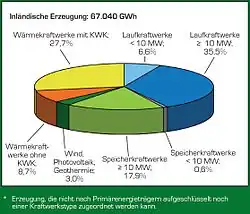 Die Stromerzeugung in Österreich betrug im Jahr 2009 69,0 Mrd. kWh.[4] Davon stammen 69,7 % aus erneuerbaren Energiequellen.