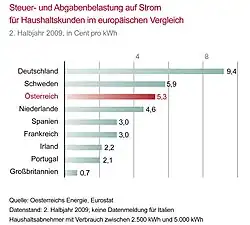 Der Strompreis setzt sich aus drei Teilen zusammen: Netzpreis, Energiepreis sowie gesetzliche Zuschläge, also Steuern und Abgaben. In Privathaushalten machen der Netzpreis und der Energiepreis circa je ein Drittel aus, dazu kommen noch die oben genannten gesetzlichen Zuschläge. Der Steueranteil von 28,0 % (2. Halbjahr 2010)[4] am Gesamtpreis für Haushaltskunden wird im EU-Vergleich nur in drei anderen Ländern übertroffen.