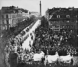 Elisabeths Leichnam wurde in einem silbernen Sarg mit einem Extrazug nach Darmstadt überführt. Unter großer Anteilnahme der Bevölkerung fand dort am 19. November ein Trauerzug auf die Rosenhöhe statt, bei dem sechs weißbehangene Pferde den Wagen mit dem Sarg zogen. Die Bestattung wurde durch den Oberhofprediger Ludwig Ehrhardt durchgeführt.[12] Elisabeths Grab wird von einer Engelsfigur mit ausgebreiteten Flügeln geschmückt, die von dem Bildhauer Ludwig Habich geschaffen wurde.