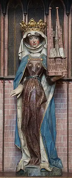 Aus etwa dem gleichen Zeitraum stammt eine Steinskulptur im Naumburger Dom, die Elisabeth mit einem Buch in der Hand darstellt. Diese Statue wird gelegentlich als noch älter als die Darstellungen des Elisabeth-Schreines und die Glasfenster der Elisabethkirche eingestuft.[93] Bildzyklen zum Leben Elisabeths befinden sich auch im vor 1350 entstandenen Krumauer Bildercodex, der in der Österreichischen Nationalbibliothek in Wien aufbewahrt wird, sowie auf den 23 etwa um 1420 bis 1430 entstandenen Eichenholztafeln, die die Brüstung des Sängerchores im Heiligen-Geist-Hospital in Lübeck zieren.[92][94]
