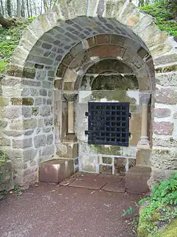 Der natürliche Quellenplatz war für eine dauerhafte Nutzung ungeeignet, hierzu wurde eine Quellfassung erstellt. Der anstehende Fels wurde um die Quelle freigelegt und in das Gestein wurde eine Art Nische eingearbeitet. Das hier aus dem Fels austretende Wasser ist in der Regel durch Schwebstoffe getrübt, daher wurde am Boden der Nische ein Sammelbecken in den Felsen eingearbeitet, der Schacht soll etwa zehn Meter tief sein, um durch die große Oberfläche möglichst rasch und viel Wasser auffangen zu können. Die unerwünschten Schwebstoffe lagern sich dann am Grunde des Schachtes ab. Zum Schutz vor äußeren Verunreinigungen und Unfällen wurde der Zugang zu dieser Nische mit einer Tür verschlossen. In einer späteren Ausbauphase wurde dieser Schacht durch eine nach außen führende Abflussleitung angebunden, das Wasser wurde in ein oder mehrere Becken geleitet, um es aufschöpfen zu können, sicher gab es in der unmittelbaren Nähe auch eine Viehtränke.