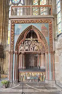 Der Schrein, in dem ehemals die Gebeine Elisabeths lagen, im Dachbereich einige Darstellungen aus dem Leben der Heiligen