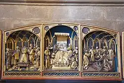 Im Unterschied zu den vier Nischenaltären entspricht der Marienaltar stärker der klassischen Form eines Flügelaltars.[61] Die Predella wurde 1509 oder 1513 und der Schreinaufsatz 1516/1517 von Ludwig Juppe geschnitzt und von Johann von der Leyten bemalt.[62] Er stand ursprünglich an der Westseite des Mausoleums und wurde in der Mitte des 19. Jahrhunderts weiter nach links versetzt. Die Flügel zeigen verschiedene Marienszenen: an der linken Außenseite die Begegnung von Anna und Joachim an der Goldenen Pforte, denen die Geburt Marias angekündigt wird, und darunter die Geburt Jesu, an der rechten Außenseite der Tempelgang Marias und unten die Darbringung Jesu. Der linke Innenflügel kombiniert die Verkündigung des Herrn, den Besuch Elisabeths bei Maria und die Anbetung der Könige und der rechte Innenflügel Marias Tod und ihre Himmelfahrt.[63] Auf dem Mittelfeld wird die Krönung Mariens durch Gottvater und Christus in goldenen und silbernen Farben dargestellt. Die Predella zeigt eine Pietà aus Kalkstein, die um 1385 im böhmischen Raum entstand und von Juppe integriert wurde.[64]