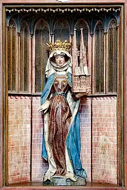Der Sippenaltar wurde 1511 von Ludwig Juppe für den Katharinenaltar geschnitzt (1302 geweiht), rechts vom Mausoleum. 1931 erhielt der Flügelaltar einen neuen Platz im Nordschiff, da er den Blick auf die Wandmalereien aus der zweiten Hälfte des 15. Jahrhunderts verstellte.[57] Auf dem linken Innenflügel ist zu sehen, wie Joachims Opfer wegen seiner Kinderlosigkeit zurückgewiesen wird, und auf dem rechten Innenflügel, wie sich Joachim und Anna, die Eltern Marias, an der Goldenen Pforte begegnen. Das Mittelfeld zeigt die heilige Familie mit den Großeltern Jesu und weiteren Verwandten. Noch ausführlicher wird die heilige Sippe auf der äußeren Werktagsseite dargestellt. Die Namen der Familienmitglieder sind dort auf Spruchbändern zu lesen. In der Nische des Katharinenaltars im Elisabethchor ist auf rotem Hintergrund zentral die Kreuzigungsgruppe gemalt, links die Enthauptung der hl. Elisabeth und rechts die Begegnung des Auferstandenen mit Maria Magdalena im Garten. Auf der linken Wand wird Anna selbdritt und auf der rechten Wand eine Heilige mit Drachen (vielleicht die hl. Margareta) dargestellt. Über der Altarnische finden sich weniger gut erhaltene Darstellungen der hl. Katharina, die vor dem Rad kniet und deren Leichnam von Engeln auf einer Bahre getragen wird, und von Maria Magdalena, die von Engeln zum himmlischen Stundengebet hinaufgeführt wird.[58]